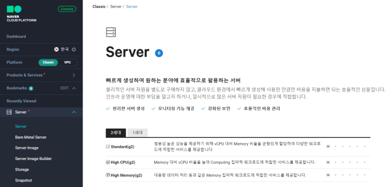 참고로 네이커 클라우드 플랫폼 콘솔 좌측 'Platform'에서 Classic과 VPC 중 선택이 가능합니다.