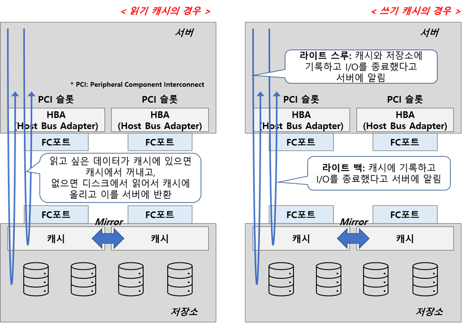 - 쓰기 시에는 캐시에만 데이터를 기록하고 완료했다고 간주하는 경우 고속 I/O를 실현할 수 있으나 데이터를 잃을 경우가 존재하여 이 캐시를 별도의 캐시와 미러링해서 안전성을 높임(Write Back) - 읽기/쓰기 시 캐시와 HDD에 모두 액세스하는 경우