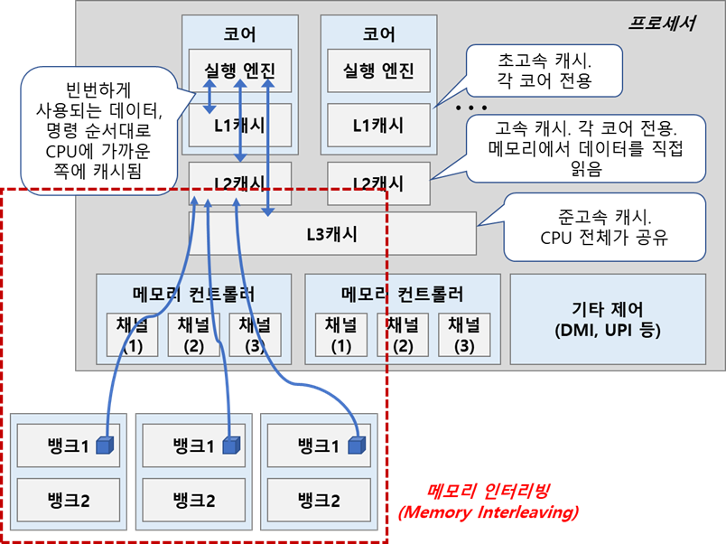 - 메모리 인터리빙: 미리 데이터를 CPU에 전달해서 처리 지연 감소